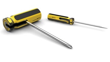 好的產(chǎn)品設(shè)計,即能滿足人們?nèi)粘I钚枰?,也能?jié)省材料,在大多數(shù)人的概念里,螺絲刀和小榔頭是兩種工具(上圖),設(shè)計師巧妙的發(fā)現(xiàn)人們的情感需求,將兩件工具合二為一。