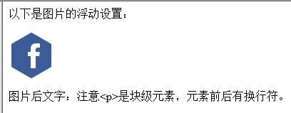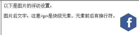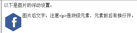 <p>以下是圖片的浮動設(shè)置:</p> <img src="image/follow-1.png"> <p>圖片后文字:注意<p>是塊級元素,元素前后有換行符。</p>